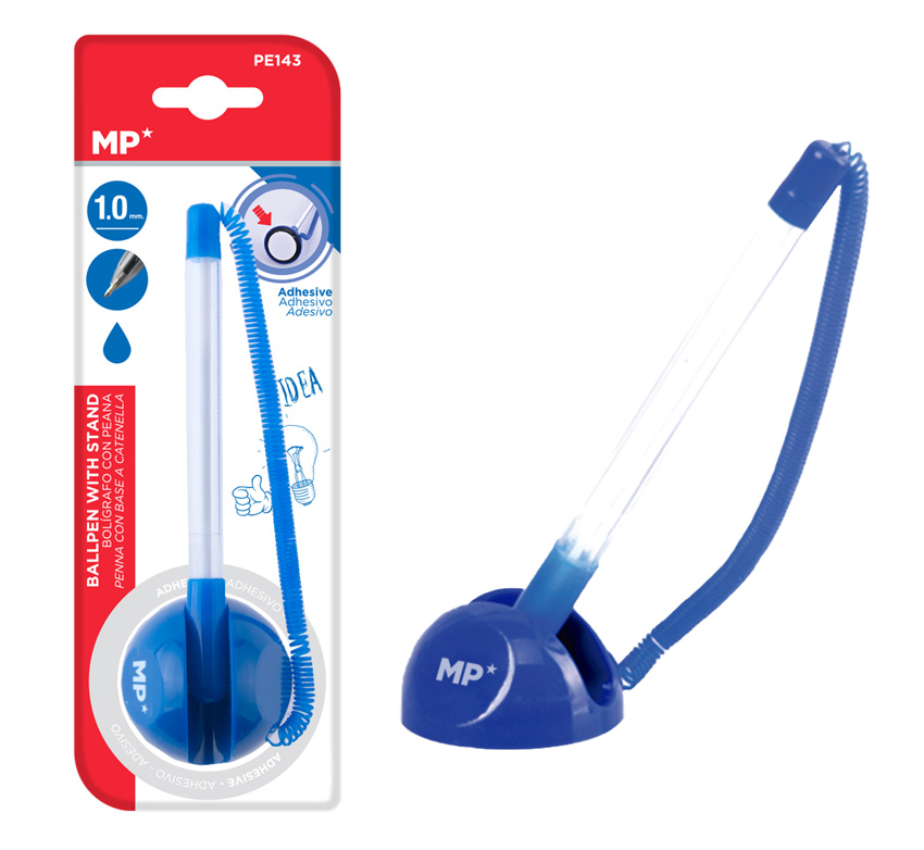 Στυλό διαρκείας της MP με βάση, ιδανικό για χρήση σε καταστήματα όπου οι πελάτες χρειάζεται να υπογράψουν ή να συμπληρώσουν έγγραφα. Η βάση του διαθέτει αυτοκόλλητη ταινία στερέωσης και το στυλό συνοδεύεται από σπιράλ καλώδιο ώστε να μην απομακρύνεται από την βάση του. Το στυλό έχει μύτη πάχους 1mm και διάφανο στέλεχος για να βλέπετε την ποσότητα του μελανιού που απομένει.