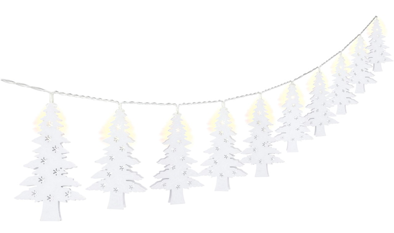 Λαμπάκια LED με διακοσμητικά μεταλλικά δεντράκια σε λευκό χρώμα που συνδέονται με ένα διαφανές καλώδιο συνολικού μήκους 1.3 μέτρα. Είναι ιδανικά για την χριστουγεννιάτικη διακόσμηση σε οποιονδήποτε εσωτερικό χώρο.
