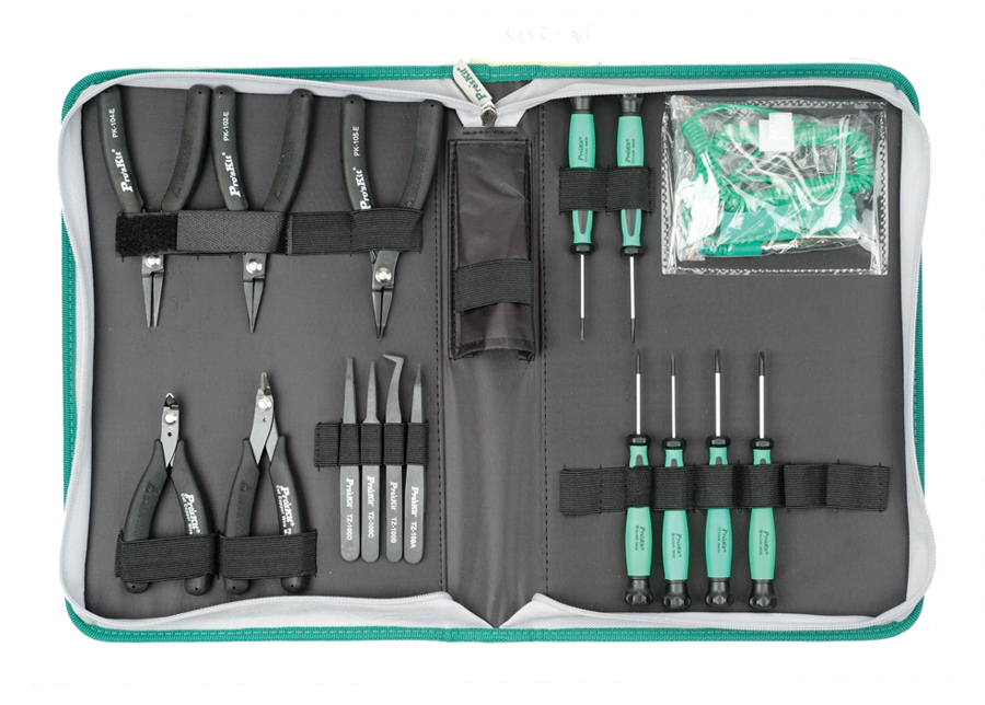 Σετ εργαλείων της PROSKIT το οποίο αποτελείται από 2x μυτοτσίμπιδα, 2x πλαγιοκόφτες, πλατυτσίμπιδο, 6x κατσαβίδια, 4x τσιμπίδες και ηλεκτροστατικό βραχιόλι.