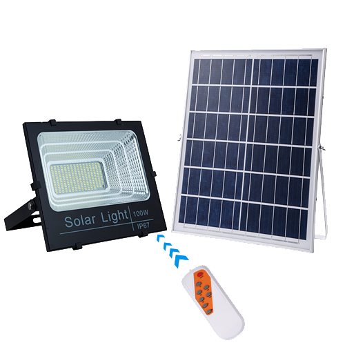 Αυτόνομος ηλιακός προβολέας LED. 100 W με τηλεχειριστήριο. Μπαταρία: Λιθίου 3,2V / 15000mAh. Χρώμα Φωτισμού: 3000 K. Διαστάσεις Φ/Β: 460x340x18 mm. Προβολέας: 290x260x95 mm.