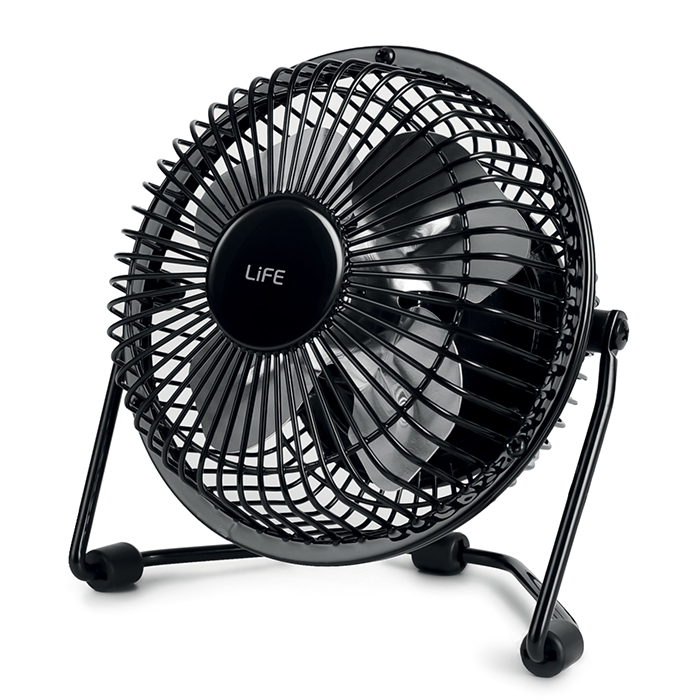 Μεταλλικός mini ανεμιστήρας με σύνδεση USB σε μαύρο χρώμα, 2.5WΠροσθέστε δροσιά στο γραφείο σας τις ζεστές ημέρες του καλοκαιριού!Ο επιτραπέζιος mini ανεμιστήρας LIFE SUPER4, με διάμετρο ανεμιστήρα 10εκ. (4'') είναι η ιδανική λύση για κάθε γραφείο, αφού χάρη στο μικρό του μέγεθος δεν πιάνει πολύ χώρο στο γραφείο σας και καθιστά εύκολη την μετακίνησή του σε όποιο δωμάτιο τον χρειάζεστε.Μπορείτε να τον συνδέσετε με το φορητό υπολογιστή σας, το powerbank ή με οποιαδήποτε άλλη συσκευή που παρέχει τροφοδοσία USB.Διαθέτει 4 πτερύγια από αλουμίνιο με χαμηλό επίπεδο θορύβου και ρυθμιζόμενη γωνία κλίσης για να κατευθύνετε το δροσερό ρεύμα αέρα όπου εσείς επιθυμείτε, χωρίς να σας ενοχλεί.Χαρακτηριστικά:- Διάμετρος ανεμιστήρα: 10cm (4'')- 4 πτερύγια αλουμινίου- 1 ταχύτητα ανεμιστήρα- Ταχύτητα ανεμιστήρα: 2400 RPM- Χαμηλό επίπεδο θορύβου- Ρυθμιζόμενη γωνία κλίσης- Μεταλλικό πλέγμα προστασίας- Μεταλλική βάση σε σχήμα U με αντιολισθητικά πέλματα για υψηλή σταθερότητα- Διαστάσεις συσκευής: 15 x 10 x 16cm- Μήκος καλωδίου: περ. 1m- Τροφοδοσία: DC 5V μέσω καλωδίου USB Type-A- Ισχύς: 2.5W- Καθαρό βάρος: 300g- Χρώμα: Μαύρο - ασημί- 2 χρόνια εγγύηση