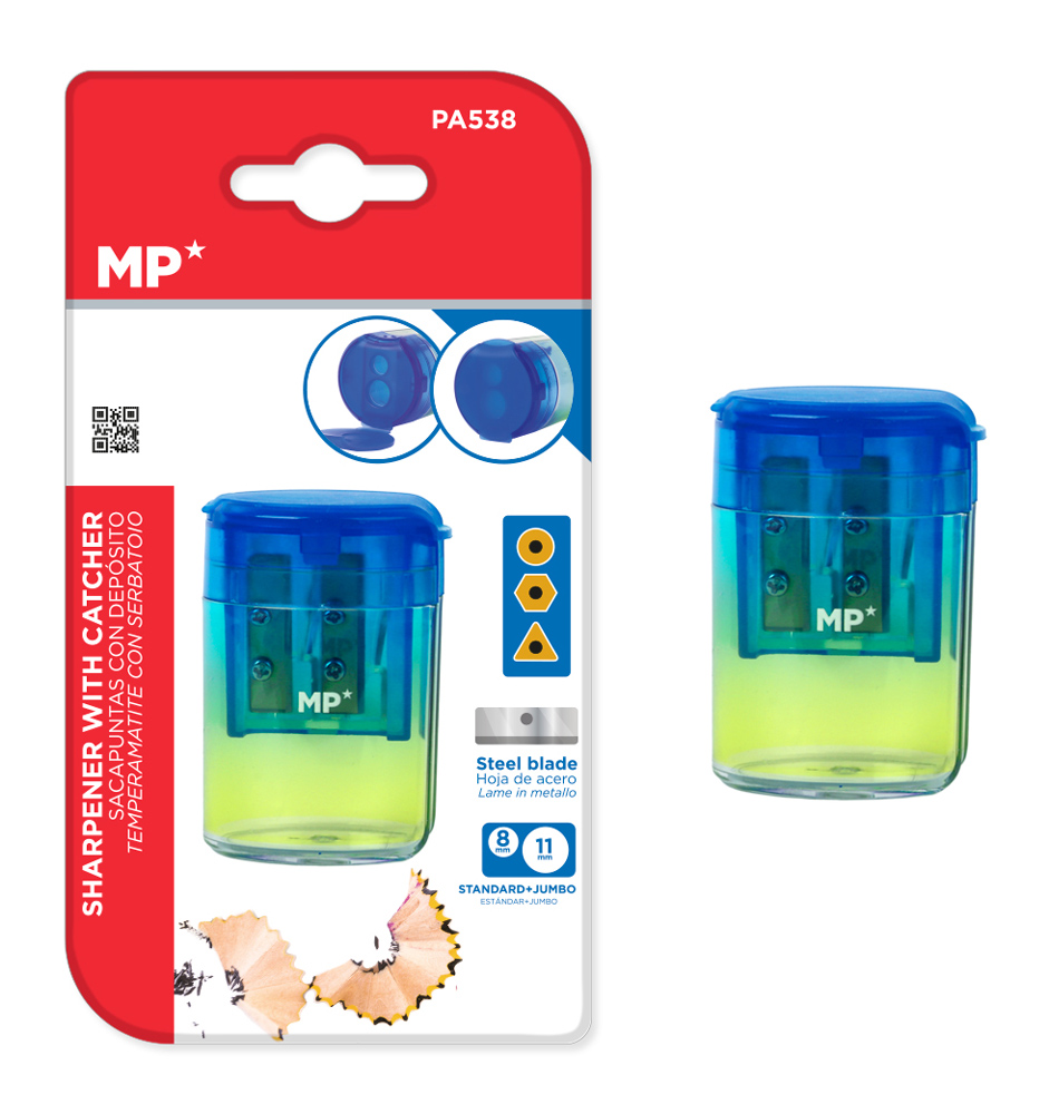 Ξύστρα μολυβιών της MP με μεταλλική λεπίδα και ενσωματωμένο κάδο απορριμμάτων για καθαρό και εύκολο ξύσιμο χωρίς υπολείμματα.