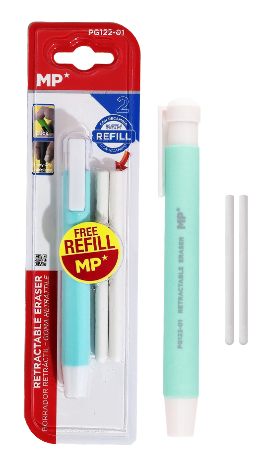 Μηχανική γόμα της MP για εύκολο σβήσιμο μολυβιού, που δεν αφήνει υπολείμματα. Διαθέτει πρακτικό μηχανισμό με κλικ για την προώθηση και επαναφορά της γόμας ενώ στη συσκευασία συμπεριλαμβάνονται 2x ανταλλακτικές γόμες για μεγαλύτερη διάρκεια χρήσης.