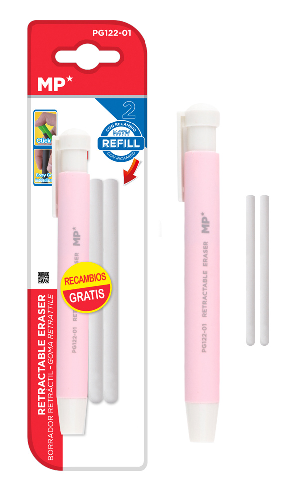 Μηχανική γόμα της MP για εύκολο σβήσιμο μολυβιού, που δεν αφήνει υπολείμματα. Διαθέτει πρακτικό μηχανισμό με κλικ για την προώθηση και επαναφορά της γόμας ενώ στη συσκευασία συμπεριλαμβάνονται 2x ανταλλακτικές γόμες για μεγαλύτερη διάρκεια χρήσης.