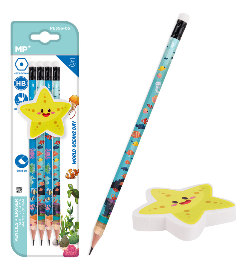 MP σετ ξύλινα μολύβια & γόμα World oceans day PPE356-05, εξάγωνα, HB, 5τμχ