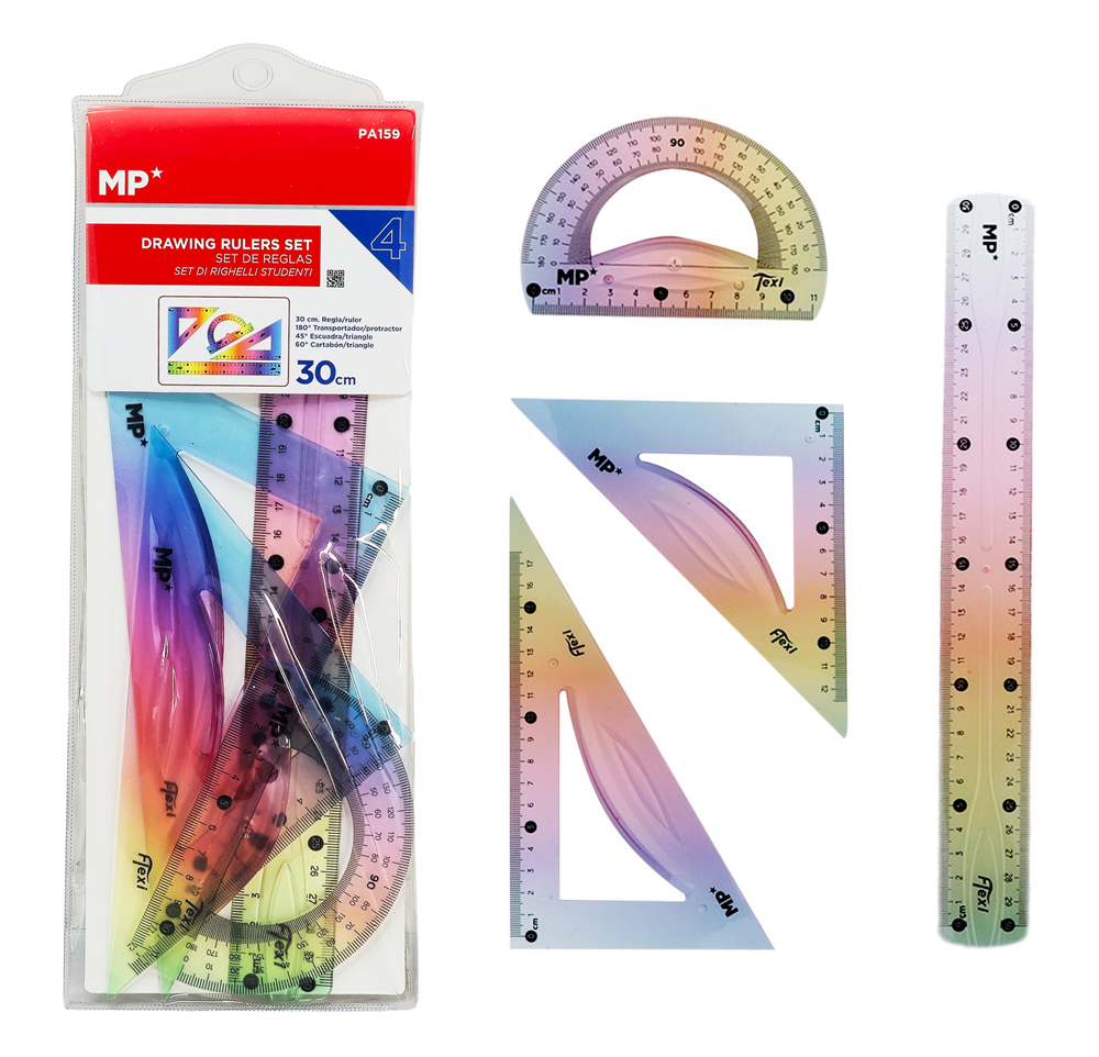 Σετ εύκαμπτοι πλαστικοί χάρακες/γεωμετρικά όργανα της MP, ιδανικοί για ακριβείς μετρήσεις και σχεδίαση στο σχολείο, το γραφείο ή το σπίτι.