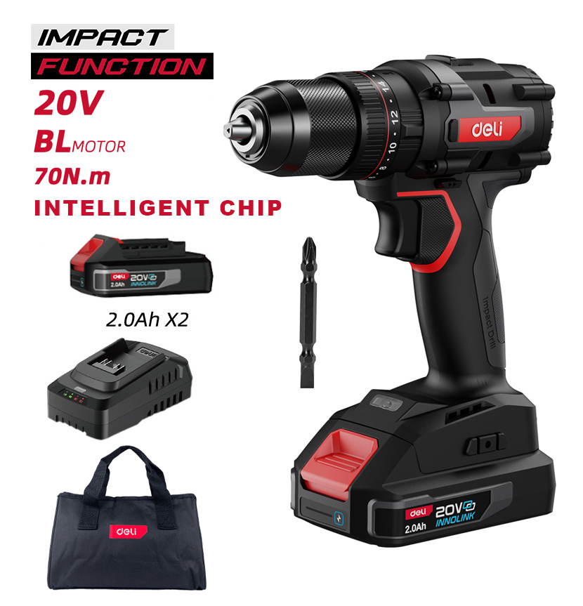 DELI κρουστικό δραπανοκατσάβιδο μπαταρίας DE-CZ20-1D2, Brushless, 20V, 2x 2Ah, 70N.m
