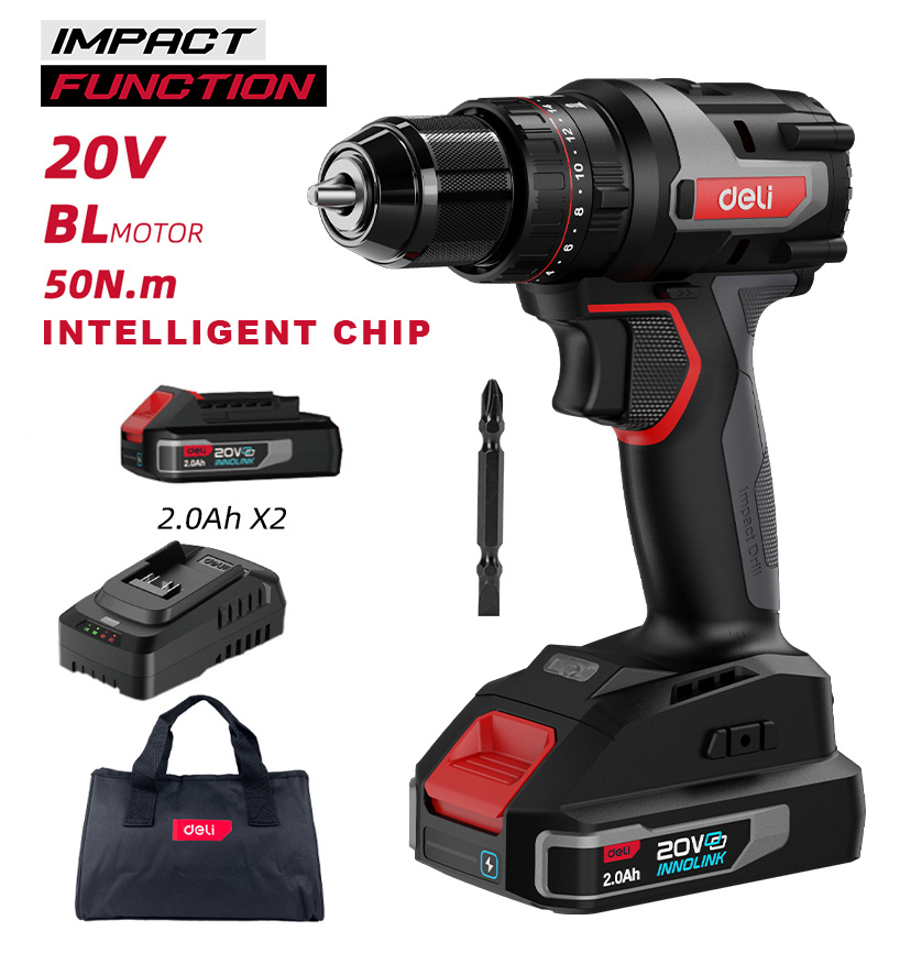 DELI κρουστικό δραπανοκατσάβιδο μπαταρίας DE-CZ20-2D2, Brushless, 20V, 2x 2Ah, 50N.m